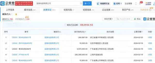 - 企查查顯示,近日,國美電器有限公司新增5條被執行人信息,執行標的合計2.8億余元,涉及服務合同糾紛、金融借款合同糾紛等案件,部分案件被執行人還包括上海民融投資有限公