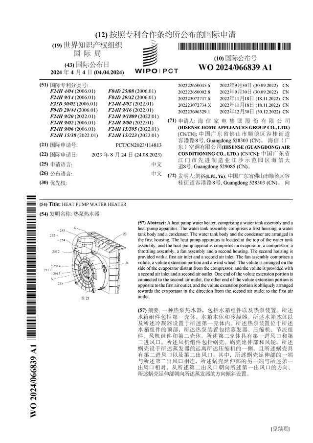 - 海信家電公布國際專利申請:“熱泵熱水器”