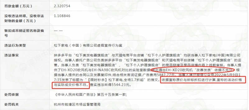 - 信用中國網站顯示,松下家電(中國)有限公司虛假宣傳被罰款2.32萬元,沒收違法所得1.11萬元。截圖來源:信用中國網站 行政處罰決定書顯示,拼多多平臺“松下美發電