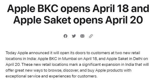 - 蘋果公司周二正式宣布,將于下周在印度開設第一家蘋果官方零售店,凸顯出這家科技巨頭將印度作為重要增長市場和制造基地的雄心。 蘋果的在線商店于2020年9月在印度推出,但直到現在該公司