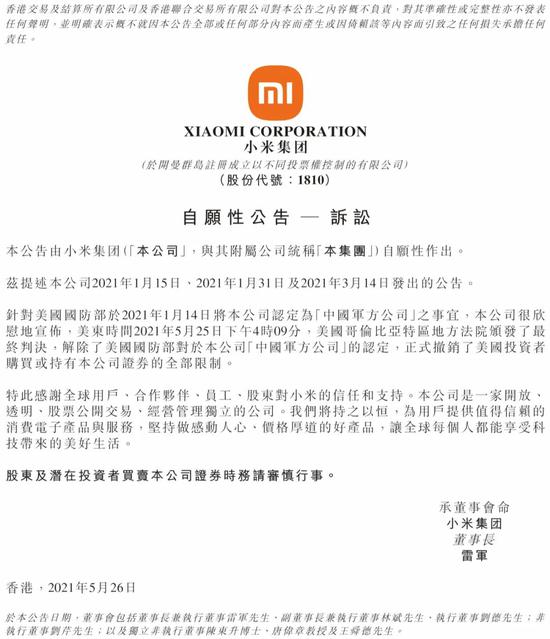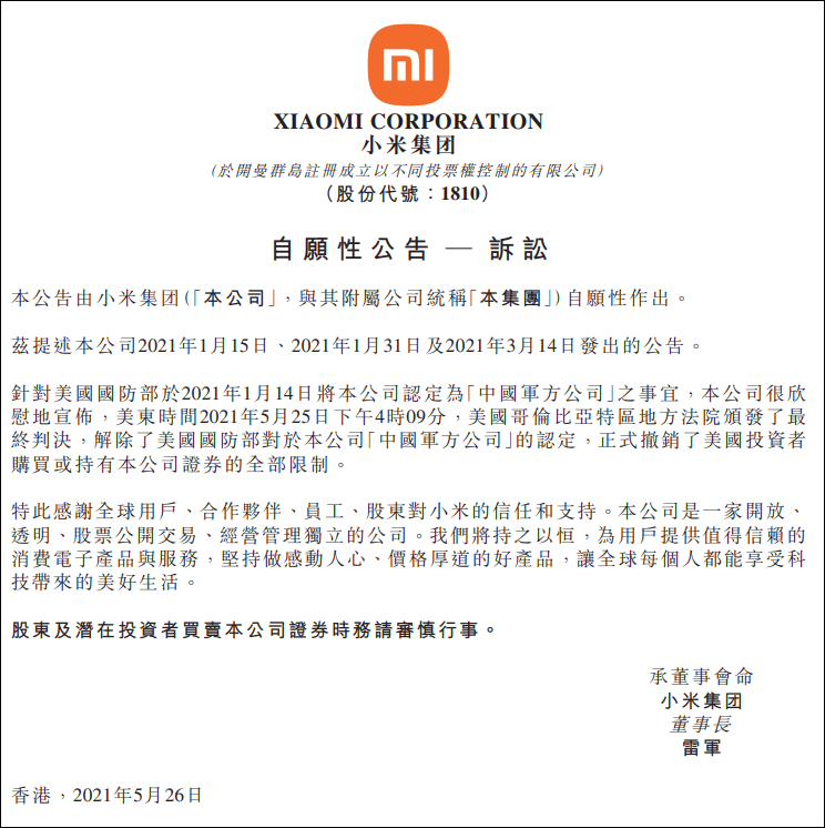 - 小米集團(下稱“小米”)5月26日發布公告,美東時間5月25日下午4時,美國哥倫比亞特區地方法院頒發了最終判決,解除了美國國防部對于小米屬于中國軍方公司的認定,并正式撤銷了