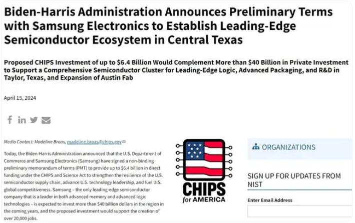 - 三星在美獲64億美元政府補(bǔ)貼