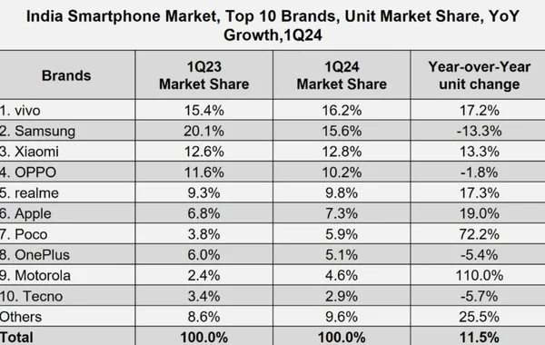 - 近日,CNMO注意到,有調(diào)研機(jī)構(gòu)公布了印度前十大智能手機(jī)品牌的最新市場(chǎng)數(shù)據(jù)。不少網(wǎng)友發(fā)現(xiàn),其中居然有八家屬于中國(guó)企業(yè)。 據(jù)調(diào)研數(shù)據(jù),2024年第一季度印度前十大智能手機(jī)品牌和它們的市場(chǎng)