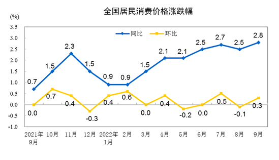 - 國家統計局:9月份居民消費價格同比上漲2.8%