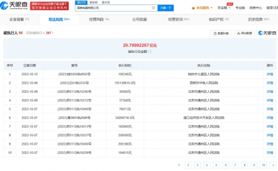 據天眼查APP統計,2022年12月底至今,國美電器共有數十條被執行人信息,被執行總金額超20億元。