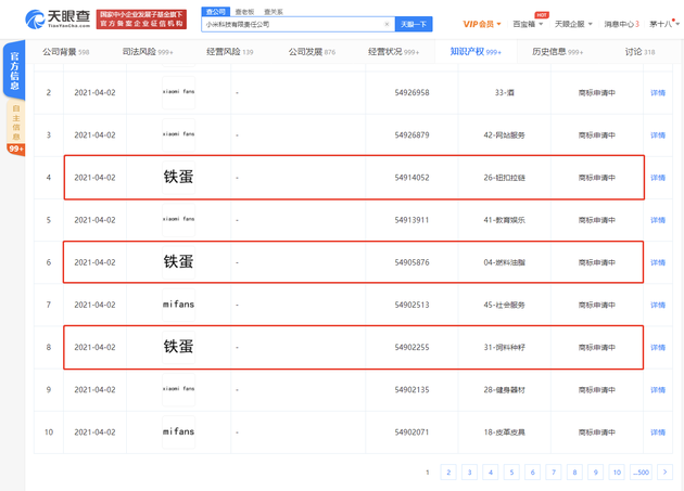 【劃重點(diǎn)】: 4月8日上午消息,天眼查App顯示,近日,小米科技有限責(zé)任公司申請(qǐng)注冊(cè)多個(gè)“鐵蛋”商標(biāo),國(guó)際分類包含食品、飼料種籽、燃料油脂等,目前商標(biāo)狀態(tài)均為商標(biāo)申請(qǐng)中。