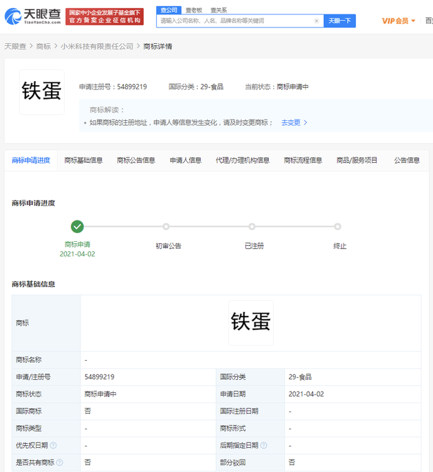 小米關(guān)聯(lián)公司申請(qǐng)注冊(cè)“鐵蛋”商標(biāo)