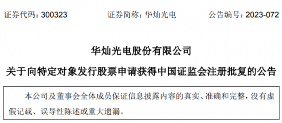 【家電資訊-家電新聞 - 上市企業,作者:編輯】7月5日,華燦光電發布公告稱,近日收到中國證監會出具的《關于同意華燦光電股份有限公司向特定對象發行股票注冊的批復》,同意公司向特定對象發行股票的注冊申請。