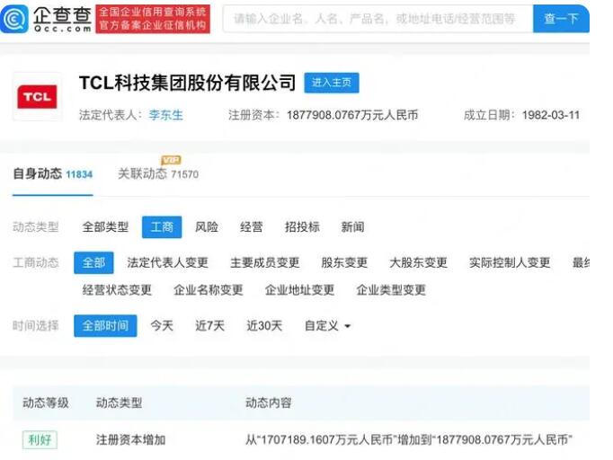 - TCL科技注冊資本增加至187億