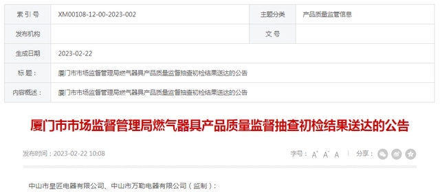 - 2023年2月22日,廈門市市場監督管理局發布燃氣器具產品質量監督抽查初檢結果送達的公告。 廈門市市場監督管理局燃氣器具產品質量監督抽查初檢結果送達的公告 中山市皇匠電器有限公