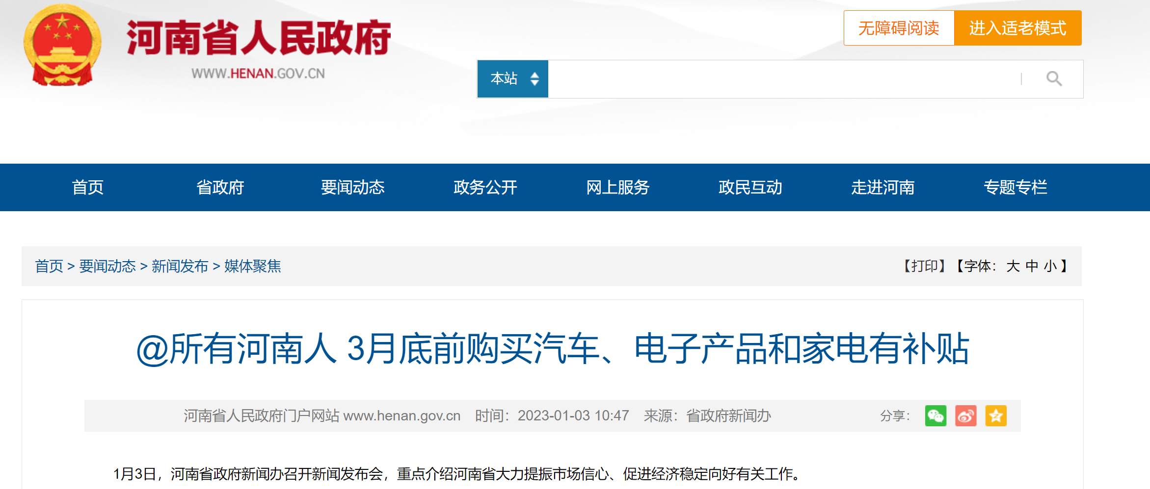 河南:3月底前購買汽車、電子產品和家電有補貼