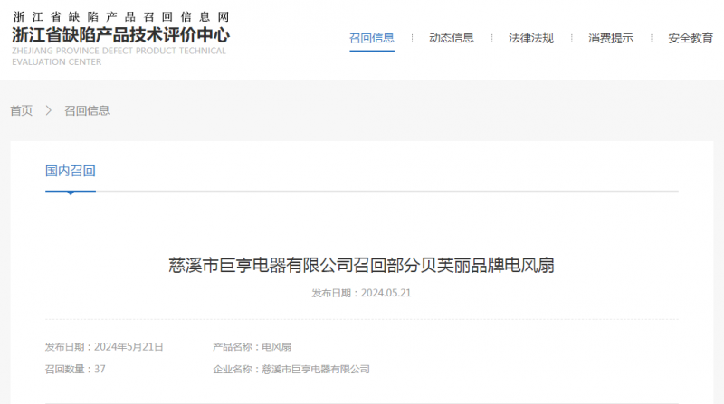 - 慈溪市巨亨電器有限公司召回部分貝芙麗品牌電風扇