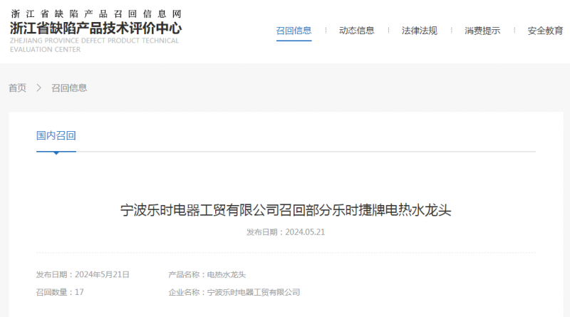 - 寧波樂時電器工貿(mào)有限公司召回部分樂時捷牌電熱水龍頭