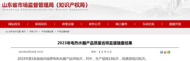 - 山東省市場監管局抽查電熱水器產品35批次 1批次不合格