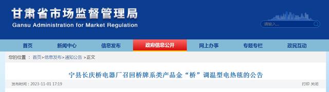- 「甘肅」寧縣長慶橋電器廠召回橋牌系類產品金“橋”調溫型電熱毯