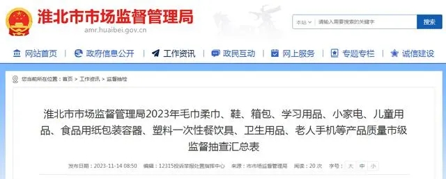 - 11月14日,安徽省淮北市市場監督管理局網站公布2023年毛巾柔巾、鞋、箱包、學習用品、小家電、兒童用品、食品用紙包裝容器、塑料一次性餐飲具、衛生用品、老人手機等產品質量市級監督抽