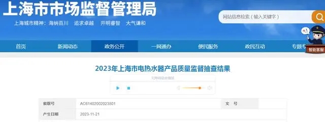 - 2023年11月21日,上海市市場監督管理局網站發布2023年上海市電熱水器產品質量監督抽查結果。 近期,上海市市場監督管理局對本市生產、銷售的電熱水器產品質量進行了監督抽查。本次抽查