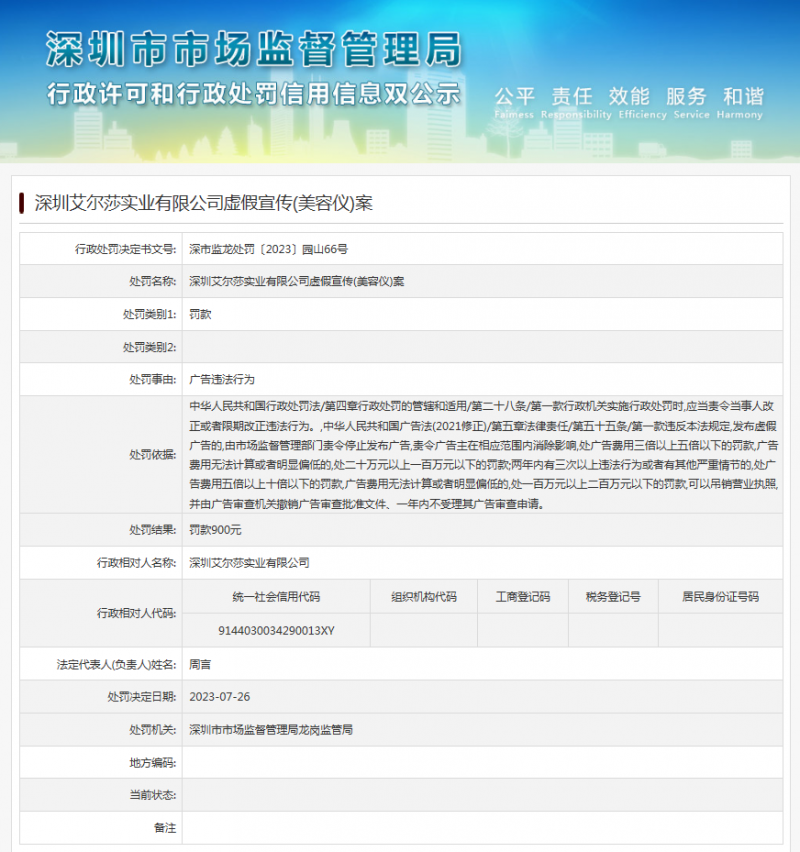 - 日前,深圳市市場監督管理局龍崗監管局發布行政處罰信息(深市監龍處罰〔2023〕園山66號),涉及深圳艾爾莎實業有限公司虛假宣傳(美容儀)案。 分享