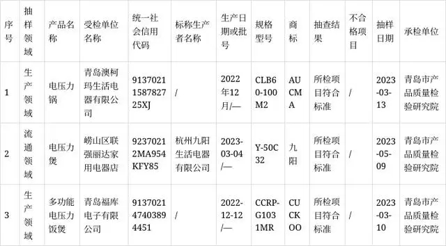 - 青島市市場監管局抽查:3批次電壓力鍋產品均合格