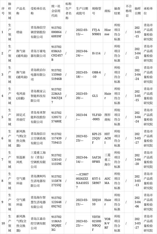 - 青島市市場監管局抽查:10批次電風扇產品均合格