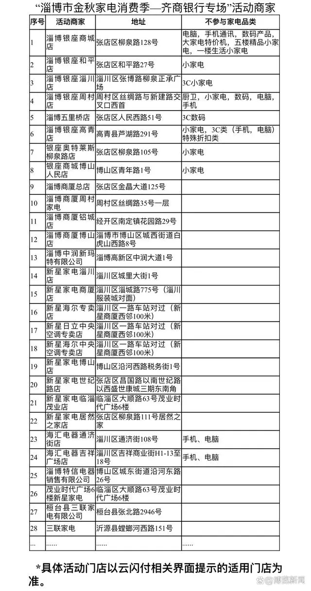 - 9月16日—10月7日,由市商務局指導,齊商銀行將聯合淄博商廈、山東新星集團、淄博銀座商城等企業共同開展“淄博市金秋家電消費季——齊商銀行專場”消費補貼活動