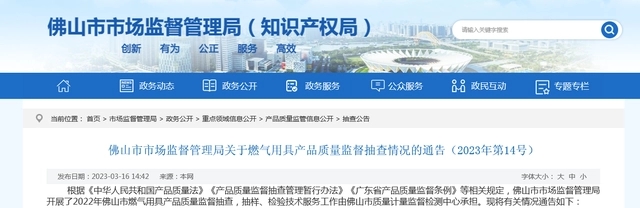 - 2023年3月16日,廣東省佛山市市場監督管理局網站發布關于燃氣用具產品質量監督抽查情況的通告(2023年第14號)。 通告稱,根據《中華人民共和國產品質量法》《產品質量監督抽查管理暫行辦