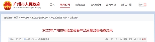 - 廣州市市場監督管理局公布2022年智能坐便器產品質量監督抽查結果