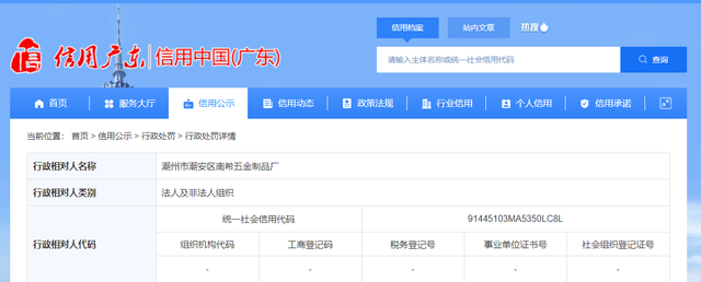 - 近日,信用中國(廣東)網站公開行政處罰信息(行政處罰決定書文號:安市監金石處字〔2023〕4號),涉及潮州市潮安區南希五金制品廠。 經查,潮州市潮安區南希五金制品廠于2022年2月生產一批次