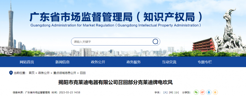 - 據廣東省市場監督管理局網站2023年3月23日消息,日前,揭陽市克萊迪電器有限公司按照《消費品召回管理暫行規定》的要求,主動向廣東省市場監督管理局報告了召回計劃,將自即日起,召回2010年6月1