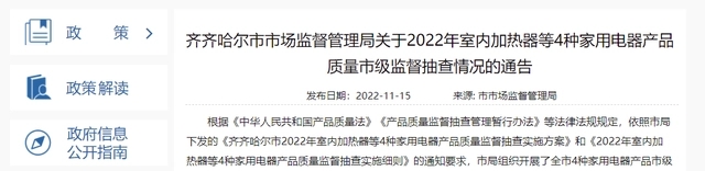 - 黑龍江省齊齊哈爾市市場監管局抽查室內加熱器產品4批次 合格率100%