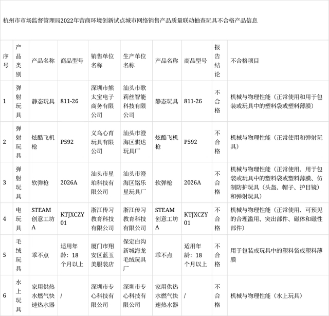 - 2022年11月25日,杭州市市場監督管理局網站發布的《杭州市市場監督管理局2022年營商環境創新試點城市網絡銷售產品質量聯動抽查不合格產品信息》顯示,6批次玩具、2批次家用燃氣熱水器不合