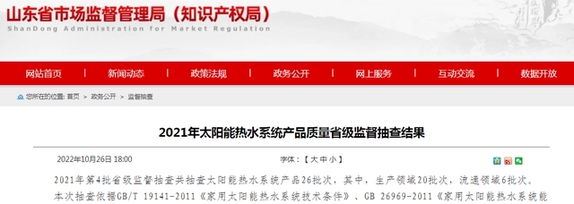 - 山東省市場監管局公布2021年太陽能熱水系統產品質量省級監督抽查結果