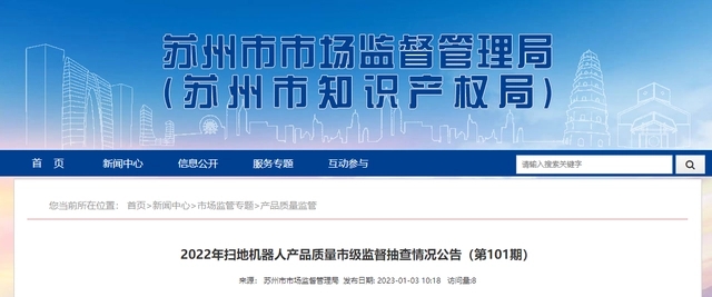 - 2023年1月3日,江蘇省蘇州市市場監督管理局網站發布2022年掃地機器人產品質量市級監督抽查情況公告(第101期)。 2022年,蘇州市市場監督管理局委托蘇州市產品質量監督檢驗院對掃地機器人