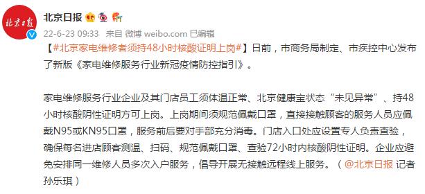 - 日前,市商務局制定、市疾控中心發布了新版《家電維修服務行業新冠疫情防控指引》。 家電維修服務行業企業及其門店員工須體溫正常、北京健康寶狀態“未見異常”、持48小時