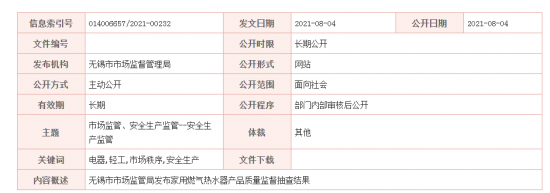 - 無錫市市場監管局發布家用燃氣熱水器產品質量監督抽查結果