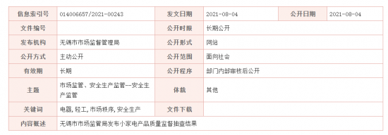 - 無錫市市場監管局發布小家電產品質量監督抽查結果