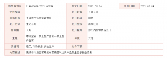 - 無錫市市場監管局發布家用燃氣灶具產品質量監督抽查結果