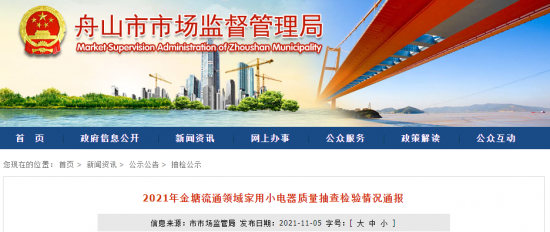 - 2021年11月5日,浙江省舟山市市場監督管理局網站發布2021年金塘流通領域家用小電器質量抽查檢驗情況通報。 據通報,為進一步加強轄區流通領域商品質量監管,金塘組織開展了2021年流通領域