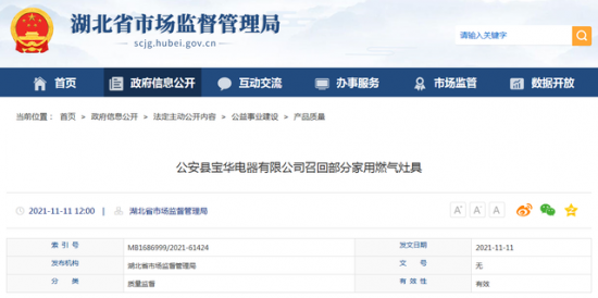 - 據湖北省市場監管局網站11月11日消息,日前,公安縣寶華電器有限公司向湖北省市場監督管理局備案了召回計劃,決定自2021年11月15日至2022年2月13日召回2019年6月生產的部分家用燃氣灶具,品牌: