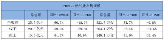 燃氣灶方面,2021年一季度全渠道零售額為35.5億元,同比增長60.3%,零售量為523.3萬臺,同比增長34.7%。