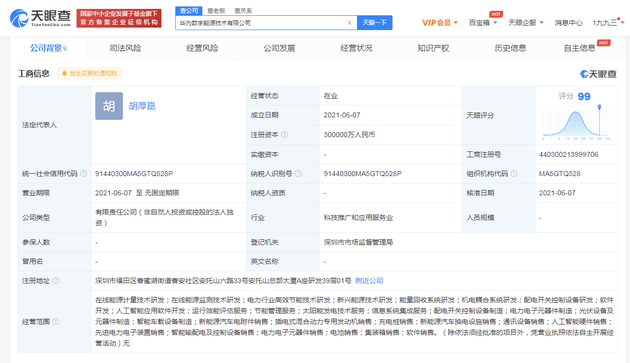華為30億成立數字能源公司 法定代表人為胡厚崑
