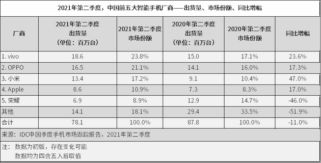 而在IDC近日發布的2021年第二季度中國智能手機市場報告中,榮耀的出貨量為690萬,占據了8.9%的市場份額,位居第五位。