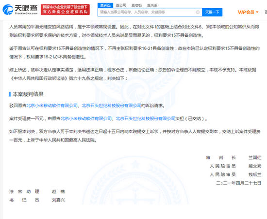 本案裁判結果為駁回原告北京小米移動軟件有限公司、北京石頭世紀科技股份有限公司的訴訟請求。