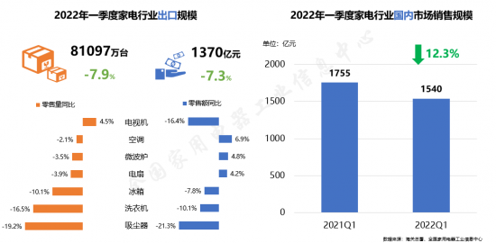 全國家用電器工業信息中心研究員楊征對《2022年中國家電行業一季度報告》進行了全面解讀。2022年一季度家電行業國內累計銷售額1540億元(品類涉及彩電、白電、廚衛、小家電產品),較上一年同比下降12.3%。另據海關總署數據顯示,2022年1-3月我國家電產品出口額累計1370億元(人民幣值),同比下降7.3%。各地疫情頻發導致線上線下銷售均受到不同程度的影響,其中線上零售額同比下滑4.4%,線下零售額同比下滑幅度達到19.4%。