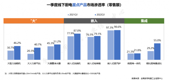 疫情的反復導致居民消費意愿受到抑制,原本應該迎來銷售旺季的廚衛電器在一季度的表現不及預期,整體銷售規模同比下降9.7%,但集成灶、洗碗機等新興品類仍處在上升通道,市場規模分別同比增長31.5%、17.7%。傳統廚電方面,大火力燃氣灶、大吸力油煙機市場滲透率持續增長。嵌入式廚電可以滿足當下消費者在不同場景中的多樣化需求,因而受到消費者青睞,如嵌入式洗碗機一季度在線下洗碗機市場的零售額占比已達到87.0%。集成灶作為集成廚電的代表,市場熱度持續攀升,其中蒸烤集成灶產品在線下市場的零售額占比達到55.0%。