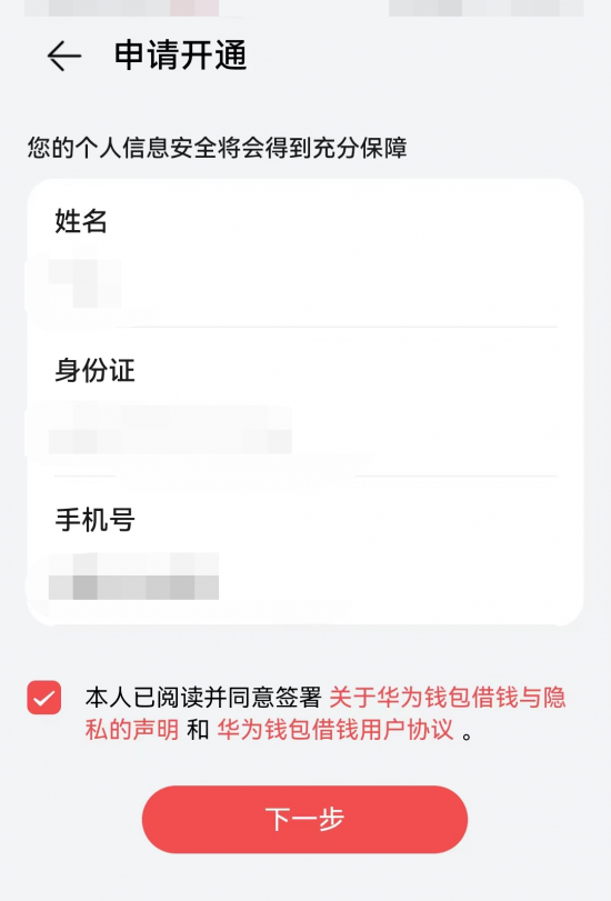 在信息的下方有一處“點(diǎn)擊查看可借額度”的按鈕,點(diǎn)進(jìn)去之后就會跳轉(zhuǎn)到“華為錢包”的APP,顯示的內(nèi)容則為“申請開通”,并彈出手機(jī)用戶的姓名,身份證以及手機(jī)號,并有一欄“本人已閱讀并同意簽署關(guān)于華為錢包借錢與隱私的聲明和華為錢包借錢用戶協(xié)議”需要進(jìn)行勾選。