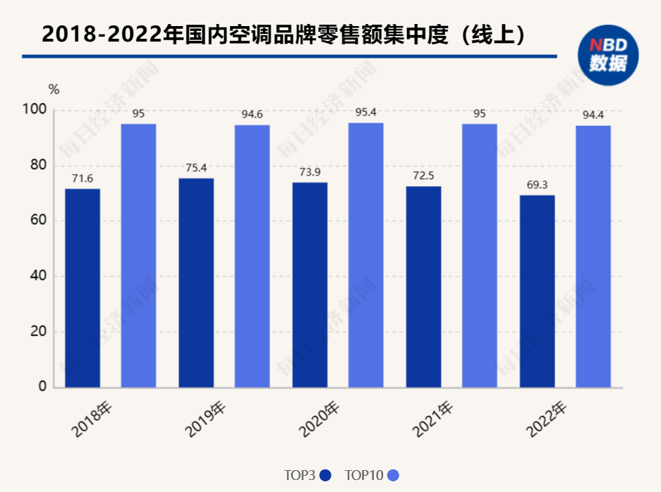 但巨頭也并非“高枕無憂”。雙寡頭(格力、美的)2021年線上線下渠道總市占率輕微下降,其中線上渠道下降較為明顯。到2022年,美的、格力線上渠道零售額集中度下降至57.1%;線下渠道,二者市占率也下滑至66.74%。在線上市場,TOP10品牌市占率自2021年出現下降,這意味著,市場份額被小品牌“蠶食”。