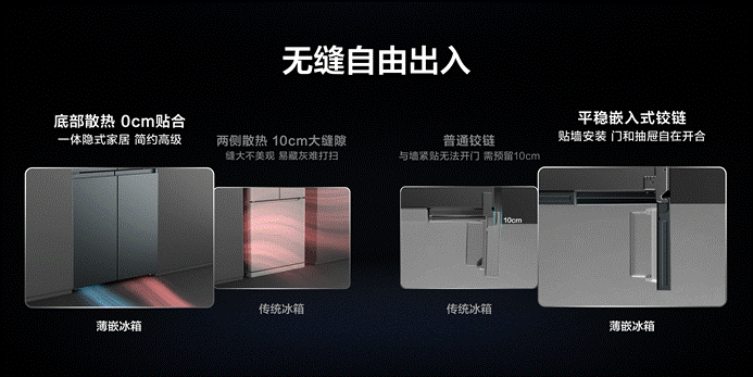 首先,在“超薄零嵌”的美學維度,TCL超薄零嵌冰箱挑戰前后左右0cm嵌入的極限,通過底部前置式散熱系統的迭代和最新平穩式鉸鏈的設計,顛覆性地做到了零縫隙嵌入的新標準;