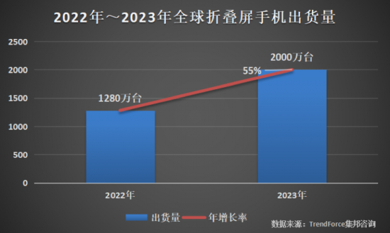 TrendForce集邦咨詢預(yù)估,2023年,折疊屏手機(jī)出貨量將達(dá)到2000萬臺,相較2022年的1280萬臺,年增長率高達(dá)55%。
