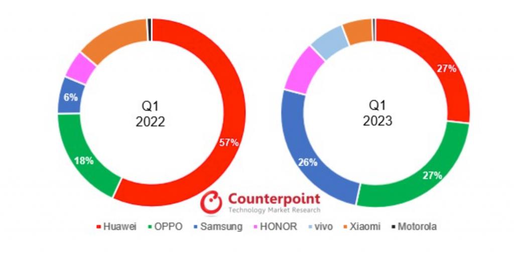 與去年同期相比,OPPO 和三星的增長十分強勁,整體的市場格局也從去年的華為過半占有率變成了華為、OPPO、三星三足鼎立的模式。